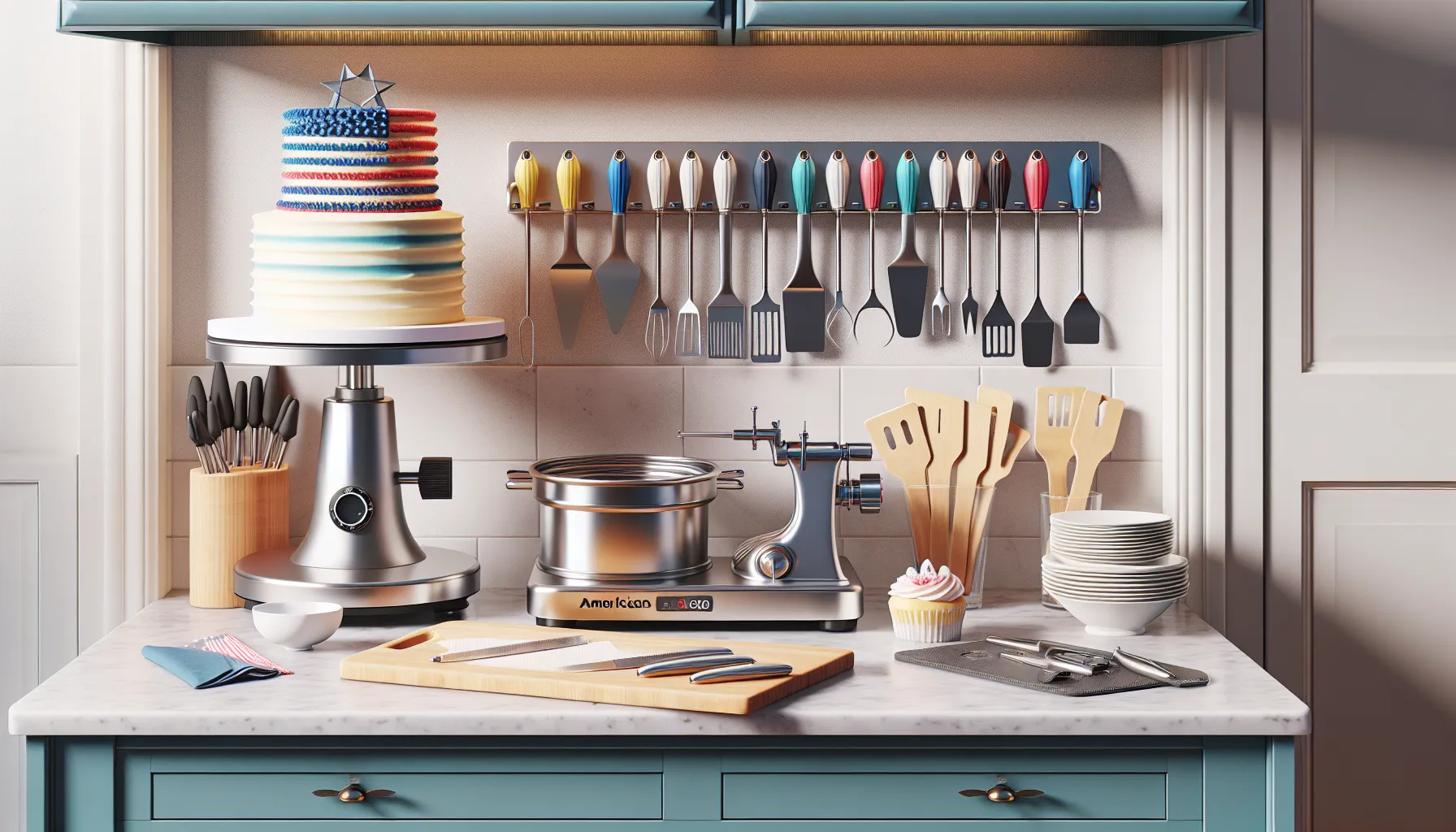 Essential tools include a turntable, piping bags and tips, offset spatulas, and a bench scraper. Additional tools like fondant accessories, food coloring gels, decorating combs, and cake boards enhance the experience for decorators.